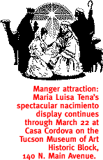 URBAN ROOTS. Let's put it thusly: If a rose were called something else, like a pude or a runch or a gank, would it still smell pretty good? Not sure on that one, but there are a few things the gardeners extraordinaire from the Pima County Cooperative Extension do know about the heavenly flora; and they're willing to sprout the facts in two lectures today. "We'll be talking about planting and pruning," says spokeswoman Francine Correll. "It's a good thing too, since January is a major planting and pruning month. We usually draw pretty big crowds this time of year." Avoid thorny rose-related mistakes with advice from the experts at one of these duplicated classes. The first one-hour lecture is at 9 a.m. at the Pima County Cooperative Extension, 4210 N. Campbell Avenue. The second is at 1 p.m. in the Wilmot Library, 530 N. Wilmot Road. For information, call 626-5161. ALL TUCKED IN. It's been nearly two decades since Maria Luisa Tena undertook a little project in honor of her mom. Little did she or her neighbors suspect that the humble nativity scene would eventually grow into a manger extravaganza. Today her nacimiento fills a big, well-lit room, replete with water flows and countless little dramatizations of tales from the Bible, holiday celebrations from across the globe and a narrative of Christ's life. That accomplishment, begun innocently enough, now likewise attracts hundreds of visitors a year. So, even if the tiresome Christmas season has you yanking at your follicles, send it off with a charming adios and visit this nacimiento, on display through March 22 at Casa Cordova on the Tucson Museum of Art Historic Block, 140 N. Main Avenue. Hours are 10 a.m. to 4 p.m. Monday through Saturday, noon to 4 p.m. Sunday. For details, call 624-2333. City Week includes events selected by Calendar Editor Mari Wadsworth. Event information is accurate as of press time. The Weekly recommends calling event organizers to check for last-minute changes in location, time, price, etc.
