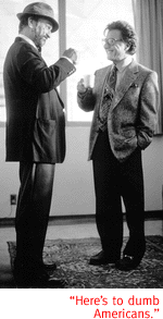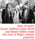 Though the marketing strategies invented to glorify this hero (who, predictably, turns out to be anything but) are amusing, they're pretty much a reprise of what we saw in Act One: different subject, same fanfare. A song is written. Information is leaked. And though it's intriguing to consider that the tie-a-yellow-ribbon campaign of the Gulf War was in fact a plot by top-level presidential advisors to create the illusion of a patriotic groundswell, one good dig does not a political satire make. By the end, the movie abandons its early promise and turns out to be obvious and predictable. Motss is especially pissed off that all the credit for a brilliantly run campaign has been given to "a couple of film students" who thought up those idiotic, overly literal and repetitious horse commercials. But really, who's wagging whom? It turns out that Wag the Dog is pretty simple itself.