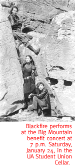 HIGHLAND STRUGGLE. Big Mountain has long been a site of struggle between the federal government and Navajos resisting removal from their homes under the controversial Hopi/Navajo relocation agreement. The idea is to return to Hopis their share of northern Arizona turf from the much larger Navajo tribe. But behind the fight lies a cabal of Washington powerbrokers, big business, and some Indian leaders with questionable alliances. Tucson gets a taste of that battle today with a Big Mountain benefit concert featuring the Native American alternative rock trio, Blackfire. Special guests include Spirit Union Revival, and the Cledd's Castle puppet show.