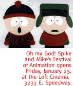 Show time is 7 p.m. at The Actors' Theatre, 7000 E. Tanque Verde Road. Performances continue at 7 p.m. Thursday through Sunday, with Sunday matinees at 2:30 p.m. through February 15. Tickets are $12, $8 for children. An optional dinner package is available for $30. Tickets are available in advance at the theater, or by calling 751-6419. EXCRETIONARY JUDGMENT. Shameless repulsion rears its riotous head in the irreverent Spike and Mike's Sick and Twisted Festival of Animation, screening this weekend at The Loft Cinema. The producers of the first two Beavis and Butthead films return to unleash this annual compilation of animated shorts, including premiers of Matt Stone and Trey Parker's "The Spirit of Christmas," and charming shorts such as "No Neck Joe," "Jurassic Fart," "Hut Sluts" and "Lloyd's Lunchbox."