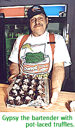 Or, if smoking's not your thing, you can belly up to the bar and talk to the heavy-set Gypsy, who peddles Hansen's smoothies and pot-laced truffles and brownies. "We're just like any other group, except we're all sick and dying," explains Gypsy, who says he's afflicted with liver cancer, which he attributes to a dose of Agent Orange the U.S. government intentionally dumped on him in Vietnam. Gypsy doesn't have much trust for the government--for example, he believes NASA has covered up film footage of astronauts walking through ruined cities on the moon.