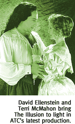 Like Prospero in Shakespeare's Tempest, written some 20 years before Corneille's play, the magical Alcandre is a stand-in for the magical illusions of the theatre. Like the befuddled Pridamant, we can never be exactly sure of what we're seeing. Each time we're seduced into a scene, it quickly dissolves and disappears forever. The characters reappear in new identities. Nothing can be grasped with any surety. Kushner adds a little post-modern overlay to all this, by making his characters--and audience--hyperconscious of the artificiality of the stage. And the illusions of the theatre are also a recurring metaphor for Corneille's view of the illusions of love: Love is never quite what it seems; young infatuations give way to married distress. The Illusion's complicated premise is clever and charming by turns, but it's not easy to find one's way into this play. The first act is overly long and confusing: Not yet initiated into the theatrical game at hand, we tire of the long speeches and the constantly changing characters. But the second act gains in intensity, as we begin to see where the author is taking us. The eight fine actors in this production, directed by David Ira Goldstein, have all played at ATC before, and they attack their parts with enthusiasm. But without the marvel of the set by Jeff Thompson, it's doubtful their Illusion could be conjured up at all. In the center of the magician's fantastic cave a red theatrical curtain falls from a circle on the ceiling: Shot through by lights and pulled up and down, it's a prison and a garden and a curtain to the past. A wide semicircle at rear stage frames the heavens and the earth. Most importantly, there are mechanical contrivances of all sorts, the magician's tools for his illusions. From a frankly fake metallic contrivance, Alcandre manages to prop up the full moon, whose lovely light shines upon the lovers. It's at once both true and false.