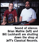 ![]() Tucson Loses Another Small Purveyor Of Class. By Emil Franzi Tucson is about to lose another of its commercial cultural institutions, Jeff's Classical Records. Like The Haunted Bookshop, Jeff's will close at the end of June. After more than 20 years, current owners Brian Mathie and Bill Luckhardt are throwing in the towel. "There are more and more slices coming from basically the same pie," says Mathie. "Call it the four B's--Barnes & Noble, Best Buy, Blockbuster and Border's," adds Luckhardt. For Jeff's, there's even a fifth B, Bookman's, whose two locations now compete in the used recording area. The problem with small business in a population-growth economy is exemplified by both Jeff's and Haunted--the competition grows faster than the population. Both had done business for more than 20 years, both had built a loyal cadre of customers, both provided a reasonable selection, and both provided services unavailable elsewhere. Yet they were ultimately surrounded and forced to surrender. There are a number of reasons, some unique to Jeff's. Much of the shop was--and still is--devoted to a massive collection of new, used and rare LPs. The collector interest in black discs, while still present, has hardly grown in the years since CDs came into wide use. Many collectors have discovered most of what they once paid a premium for on vinyl has been reissued on CD for lower cost in a better format. And sales of new classical CDs are off, mainly because most major recording companies keep re-issuing the same war horses most classical listeners already have. Listeners just aren't willing to pay $15 or more for a new version that sounds pretty much the same as many others. Jeff's and similar operations, like The Haunted Bookshop, are also facing stiffer competition from mail-order catalogs as well as record and book clubs. And bookstores have to fight off everything from the Costco-type operations to supermarkets while competing for your book-buying dollar. Jeff's is named for its original owner, Jeff Weinstein, who started the store in 1976. It's moved several times since. Weinstein sold the store in 1991 to his two employees, Mathie and Luckhardt, went off to law school at the UA and landed a job as a Pima County public defender.