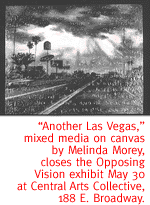 Morey is known for her haunting, beautiful roadscapes incorporating the endless blacktop as a metaphoric springboard into the realm of spaciousness, possibility and the duality of existence. Circus imagery, dramatic lighting and fantastic color combinations give life to Yopp's emotionally charged woodcuts and etchings. Her pieces confront the viewer, narrating powerful stories of family dynamics, power struggles and personal chaos. Exhibit runs through May 30, with an opening reception from 6 to 8 tonight, in the Central Arts Collective, 188 E. Broadway. Regular gallery hours are noon to 4 p.m. Tuesday through Saturday, and during Thursday night Art Walk and Downtown Saturday Night. Call 623-5883 for information.