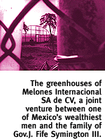 ![]() Gov. J. Fife Symington lll Has Built Extensive Mexican Connections By John Dougherty THE TAXI COMES to a halt on a two-lane paved road bisecting Villa Juárez, a bustling, peasant farming town in the heart of one of Mexico's most fertile farming valleys. A herd of cattle blocks the road, paralyzing traffic on this busy farm highway about 25 miles south of Culiacán, the capital of the state of Sinaloa. A couple of horse-mounted cowboys wearing wide-brimmed hats prod at 30 or so longhorned cattle. The animals prove reluctant; traffic quickly backs up. Several flatbed trucks idle roughly. The backs of the trucks are jammed with young men and teenagers pressed against wooden slats. The convoy is ferrying the field workers to nearby farms owned by a few fabulously wealthy Mexican families. Semi-tractor trailers pump diesel fumes into the afternoon air. The trucks are coming and going from packing plants, where they collect produce for shipment 600 miles north to Nogales, Arizona, and into U.S. supermarkets. But no one is going anywhere until the cattle move. With a series of sharp whistles, the cowboys steer the last few stray cattle off the main highway. The taxi drives south a few more miles and then turns west, down a narrow dirt road that passes campesino settlements, where farmworkers live in tin sheds and household water is gathered from pesticide-laced irrigation canals. On the horizon, several dozen long greenhouses dot the landscape. But obtaining a close-up view of the greenhouses is almost impossible. They're surrounded by a chain-link fence with three strands of barbed wire across the top. Sheets of plastic are attached to the fence. A guard refuses to let visitors enter. Farmworkers say melons are grown and harvested in the greenhouses. Then they are sent to a nearby packing shed, where some are shipped to Japan. The planting season is in the spring, with harvest in fall. The greenhouses mark the home of Melones Internacional SA de CV, a joint venture between one of Mexico's wealthiest men, Alejandro Canelos, and someone named J.Fife Symington. The question is: Which Fife Symington? MAY 20, 1996. Skeptical attorneys are grilling the wife of Arizona Governor J. Fife Symington III. The governor has filed bankruptcy. The attorneys don't believe he's as destitute as he has claimed and are questioning his wife under oath, looking for hidden assets. "Are you an investor in any partnerships currently?" Phoenix lawyer Jeffrey Goulder asks Ann P. Symington. "I have an investment in Melones Internacional," the governor's wife replies. "What is Melones?" Goulder asks. "It is a fruit-growing concern in Sinaloa," Mrs. Symington replies. The business, she testifies, is operated by her stepson, J.Fife Symington IV. Mrs. Symington tells Goulder she invested $25,000 in the partnership, which her son was syndicating. The investment was made in November 1995, two months after her husband filed bankruptcy, claiming he had $26 million in debts and a mere $62,000 in assets. During the deposition, however, Goulder did not learn several important facts about Melones Internacional. He didn't learn that it is part of one of the largest farming operations in the world. He didn't learn that Melones Internacional is more than a simple agricultural partnership. He didn't learn that Melones Internacional's president, Alejandro Canelos, is one of the wealthiest and most powerful agriculturalists in Mexico. And Goulder didn't discover that one of Mrs. Symington's close family members is on the board of directors of Melones Internacional. A family member by the name of "J. Fife Symington," according to incorporation records the Phoenix New Times obtained in Mexico. Those records do not specify whether this Melones Internacional director is Arizona's governor, J. Fife Symington III, or his son, J. Fife Symington IV (or, for that matter, J. Fife Symington Jr., the governor's father). Using the name "J. Fife Symington" in business documents without generational designation is a departure for the Arizona Symingtons. Here, the two men have been careful to separate their business interests. Arizona Corporation Commission records show the governor affixes "III" and his son "IV" to their names in corporation filings.