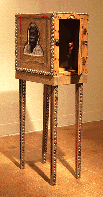 Other artists borrow not just the materials but the structure of the shrines. Alex Garza, a Tucsonan who curated the show, offers up "Lola's Cage," a sad little altar to a restricted life. It features a wooden box covered in burlap, emblazoned with photographs on cloth of an old Hispanic woman's face. The box is fashioned into a jail cell, with barred windows and door. Inside, on the floor, is the barrio's trademark linoleum. The walls bear pictures of saints. Lola is inside too, in the form of a little mummy figure with a photo of her puzzled face glued to the head. If she sees her little box shrine as a haven, Garza suggests it's a prison barred up by religion and sex roles.