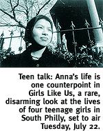 Equally disturbing, although not quite as focused, is Girls Like Us, airing July 22nd, a condensing of four years in the lives of four adolescent girls in South Philadelphia. We're quickly introduced to the four: Anna, a first-generation Vietnamese girl, whose father is relentlessly strict about her interactions with boys; Lisa, a dedicated student in a Catholic school, who's had the same boyfriend since she was 12; De'Yona, bouncy and full-of-life, who, like Mayra, seems bound and determined to meet her lofty goals; and Raelene, an ill-educated girl who's already dropped out of school and is taking care of her baby daughter. Filmmakers Jane Wagner and Tina DiFeliciantonio clearly have a strong rapport with their young subjects, following them and charting the courses of their lives with respect and interest. What's surprising is how difficult it is for these young women just to get by and move forward with their plans. In the course of the film, De'Yona's cousin is shot to death, sending her into a downward spiral (in her miserably matter-of-fact words, she "just didn't care anymore"), flunking her senior year and getting pregnant; Raelene has another child and moves away to the Poconos; and Lisa moves from one "committed" relationship to the next. After the four years, she's the only one who successfully gets out, going off to college after yet another failed relationship. Anna plans on going to school that next year, but not before swearing off boys.