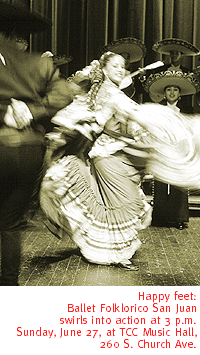 This comedic masterpiece by Ivan Menchell features Cityplayers regulars Colleen Kellener and Bella Vivante, along with Ina Gillers-Shivack, Jonathan Lawson and Peaches Guisinger. Today's performance is at 3 p.m. in the Cityplayers Studio Theatre, 37 W. 33rd St. Performances continue at 8 p.m. Friday and Saturday, 3 p.m. Sunday, and 7:30 p.m. Monday through July 18. Tickets are $11, $10 for students and seniors, and available at Keuken Dutch restaurants, The Emerald City Grille, or by calling 620-6099. TOP TROUPE. They may be Tucson's official folklorico group, but that doesn't mean Ballet Folklorico San Juan is content to rest on their laurels. Today, they prove that point with a colorful performance by 150 dancers, and more mariachi music than you can shake a guitara at. Stunning scenery and lavish, authentic costumes add spice to their collective skills. Show time is 3 p.m. in the TCC Music Hall, 260 S. Church Ave. Tickets are $8, $6 for children ages 12 and under, and available at the TCC box office and Dillard's. Call 544-9543 for details. BELLY BASH. Tucson gets a taste of exotic, foreign shores--via tight local abs--when Dancers in the Desert Belly Dance Club presents Cleopatra's Dream. This fantastic afternoon of dancing hearkens to the Mediterranean, where the lovely, sensuous style has been a mainstay for centuries. The performance runs from 3 to 5 p.m. in The Mat Bevel Institute, 530 N. Stone Ave. Tickets are $5, $2 for children ages 7 to 12, free for children ages 6 and under, and available at the door. Call 750-0004 for details.