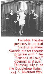 SUMMER LOVIN'. The Invisible Theater cranks up interpersonal temperatures with Seasons of Love, part of the Sizzling Summer Sounds series. This amorous-minded musical cabaret features Tony Award-winning Broadway tunes by an ensemble that includes Jeff Haskell on keyboards with "Mr. Broadway" Jack Neubeck, and Tucson vocal veterans Betty Craig and Liz McMahon. That's in addition to IT regular Stuart Moulton, who makes an appearance as the indomitable Carol Channing. Tonight's performance is at 8 p.m. in the Doubletree Hotel, 445 S. Alvernon Way. Performances continue at 8 p.m. Friday, 2 p.m. Sunday, and 8 p.m. Wednesday through Saturday, July 8 through 11. Tickets are $16 and $17.50. For reservations and other information, call 882-9721.