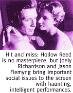 Martin Donovan (best known for his endless roles in Hal Hartley movies) does what he's best at here: a slow, controlled, emotional burn. He clearly loves his boyfriend (there's some rare, hot guy-on-guy footage in Hollow Reed), but his drive to protect his son supercedes everything else in his life. Donovan is an excellent brooder; even when he's just staring into space (as he often does in this movie), it's clear that he's troubled. It's this tenacity that eventually makes Martyn the dubious hero of the story. Director Angela Pope has made her way to features from British TV, and at times in Hollow Reed the conventions of television show through. Rather than being of-a-piece, Hollow Reed is divided into three half-hour little sections, each with it's own shocking revelation and climax. As a result, the whole lacks tension and momentum--at several points in the story, it seems like the movie could have just ended. And at times the film gets bogged down with social issues in an annoying, issue-of-the-week sort of way. Though certain vital and fascinating themes arise naturally in the story--the difficulty of divorce for children, for example--others, like the enthusiams of the courts for depicting gay relationships as perverted, seem forced and tacked on.