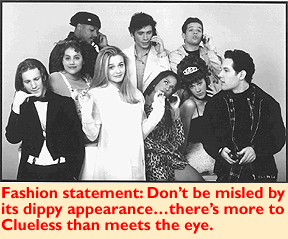 THERE ARE FEW among us who have looked at the poster for Clueless and found ourselves responding with, "Gee, this movie looks terrific!" And no wonder: The idea of a movie about cellular phone-toting high-school girls in knee-high socks doesn't exactly start one's fingers itching to hand out $7.50 at the cineplex. Who wants to spend an hour and a half listening to women talk like hybrids of Moon Unit Zappa and Joan Rivers anyway? I mean, that's like so Eighties.