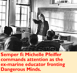 To maintain this ideal, Pfeiffer's persona is crafted out of equal parts documentary and fantasy. With her melting eyes and her ability to keep a strong sense of acceptance aglow behind her tough demeanor, could there be more ideal casting for this educational love object? (The picture might be retitled To Ma'am With Love.) Following Pfeiffer's lead, the young actors, a terrific combination of pros and non-pros expertly directed by John N. Smith, create a moving representation of the great need less-adept students have for mentors who actually seem to give a damn about them. "What about us?" they say achingly when Pfeiffer announces her decision to retire. It's a measure of Dangerous Minds' success that you feel that ache too.