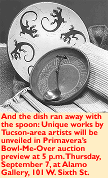 DISHING IT OUT. Preview Primavera's fifth annual "Bowl-Me-Over" auction items from 5 to 8 p.m. tonight at the Alamo Gallery, 101 W. Sixth St. Enjoy the refreshments, meet the artists and wander through an imaginative assortment of bowls in various shapes, sizes and media, from a large ceramic bowl "you could bathe a baby in" to a fragile papier-mâché vessel. They even have a dog bowl tribute to man's best friend. Other premier items include glasswork by Tom Philabaum, a handmade lace wall hanging and one of Jude Clark's signature spoons, which Primavera's Bonnie Demorotsky says are "always a big hit." Interspersed on easels throughout the exhibit will be photographs by Sandy Smith depicting "street art" on buildings, walls and cemeteries around Tucson.