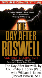 ![]() UFO Books Are Flying Off The Shelves By Christopher Weir IN A RECENTLY published hallucination, retired Army Colonel Philip J. Corso claims the military harvested alien technology at Roswell and employed it for advanced weapons development. Meanwhile, the Air Force concurs that something indeed happened near Roswell, but that it was really nothing, just a misidentified test dummy or two. What next? The CIA admitting that the U.S. government methodically lied about UFO sightings for decades? Well, since you asked....