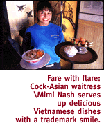 Thinking perhaps that a restaurant solely devoted to Vietnamese cuisine might be too limited and foreign for the mainstream diner, Cock-Asian also includes many familiar Chinese specialties. If sweet and sour is your thing, you'll find it here. But while Cock-Asian's treatment of Sino-inspired dishes is satisfactory, it's in the Vietnamese dishes that the kitchen manages to astound. The daily lunch buffet, a tantalizing midday gorge at $4.95, almost exclusively features Chinese dishes. Broccoli and beef, fried rice, sweet-and-sour pork, five-spice fried chicken and crispy egg rolls are typical noonday fare on Cock-Asian's lunch board. Along with a glass of iced tea (lightly scented with jasmine, thank you very much), it's a joy to meander down the line, filling your platter to overflowing with a dab of this and a smidgen of that. During one noon visit, I had no trouble satisfying my appetite, although I was not exactly bowled over by the meal. It's not that things weren't fresh or tasty; they just somehow never reached the superlative.