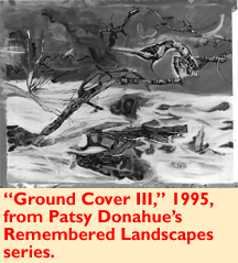 If Justice is getting restless with the photographic convention of fine printing, Donahue demonstrates in her Remembered Landscapes show that she is eminently respectful of the painting tradition. She delights in her oils on canvas, using the color fields of her wilderness scenes to revel in thick painted strokes of buttery yellow, salmon pink and pine green. Her works are the kind of paintings that on close inspection seem to be mostly about paint and color, and that only from a distance coalesce into evocative imagery.