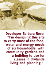 They're preparing the property for full-scale grading and the construction of concrete slabs to support prefabricated houses, designed without consideration of the site. Ironically, this land is part of an area called "El Cortaro" (from cortar, "to cut down") by the conquistadors, who obtained wood here. Ancient stumps can still be found under vigorous trees which have regrown from their roots. Now those trees are about to be erased from the land. WHAT HAPPENS WHEN such radically different approaches to living and land use come face to face across the road? In this case, not quite the usual win-or-lose battle. "We'd like to work with the town (of Marana) and developers," says Barbara Rose, the woman behind the budding permaculture center and owner of the 20-acre property. "In the end, it's how well we work together that will make or break us." Rose has learned how tough that can be.