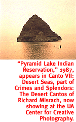 Richard Misrach's Spectacular 'Desert Cantos' Grace The Center for Creative Photography. By Margaret Regan CANTO, IN ITALIAN, is the word for song. In English, it's the name for each section of a long poem, like the cantos of Dante's Divine Comedy. For almost 20 years, California photographer Richard Misrach has been engaged in a lyrical visual examination of the deserts of the American West, a project he quite rightly calls The Desert Cantos. Like the hero of an epic poem, Misrach has journeyed again and again into the heart of the nation's dry country, in a long sweep from Texas to Oregon. The thousands of images he's shot on these excursions have been organized into 18 separate cantos, each one a piece of the larger photographic poem. The short names of the cantos compress into a single word a world of meaning: The Terrain. The Inhabitants. Clouds. Fire. Skies. About 200 pictures from this major work are now on view at the Center for Creative Photography in the stunning exhibition Crimes and Splendors: The Desert Cantos of Richard Misrach. Curated by the Museum of Fine Arts, Houston, this mid-career retrospective for the 47-year-old photographer marks the first time all 18 of the cantos, and their prologue, have been included in a single show. Gorgeous and extraordinary, the masterful color photographs of this epic, some measuring as big as 4-by-5 feet, endow the degradation of the post-wilderness West with a luminous, ironic beauty. Or as the poet W.B. Yeats might have put it, Misrach's photos capture the "terrible beauty" of the region's bomb craters and fake lakes, road scars and raging fires, Winnebagos and desert debris. In his hands, something as mundane as the red dining chairs and tables set out on the bleak sweep of Utah's salt flats ("Outdoor Dining, Bonneville Salt Flats, Utah," 1992) takes on a meaning way beyond the literal. Like the row of non-native palms aflame in a desert scrub ("Desert Fire No. 1" (Burning Palms), 1983), the weird furniture in the wilderness suggests the tragic mismatch of our civilization with nature.