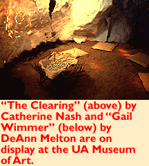 A couple of current shows at the university take stock of what happens to those who stay. The reopened Union Gallery in the Student Union (see Collage for an interview with the new director) is offering up Tucson Views Alumni Invitational, exhibiting some 23 works in paint and glass and pastel and car springs by six UA master's grads from the '70s and early '80s. Over at the University of Arizona Museum of Art, another MFA grad, Catherine Nash, has constructed two room-size installations called A Spiral to Within, in paper and pine and sand.