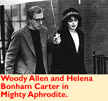 All of this may sound eerily familiar, like a cut-and-paste version of the last couple of Woody Allen movies. There's temptation by a younger woman (Husbands and Wives); there's excitement injected into boring middle- class lives by lower-class characters with heavy accents (Bullets Over Broadway); there's a dumb blonde with a peculiar voice (Bullets Over Broadway). But what makes Mighty Aphrodite different, and funny, is the wonderfully inventive addition of a Greek chorus.