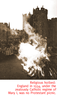 Russell-style shots of doomed Protestants being burned at the