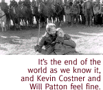 The two cavort through the wonderful set designs we can look forward to in the future. Bethlehem's army trains in a pit mine--an alien, forbidding-looking place if ever there was one--and at night they watch a scratchy print of The Sound of Music projected on a screen hung on one of the cliff-like walls. The hamlets Krantz discovers are neat, Rube Goldburg-type constructions wedged into pieces of old infrastructure--mines and dams and the like. Cool! As for Costner's proficiency as a director, the only thing I can say is this: Even though this movie combines futuristic postal workers and lots of big guns, I never thought that anyone was about to "go postal." For three hours, the words "going postal" never popped into my mind. That's got to take some skill.